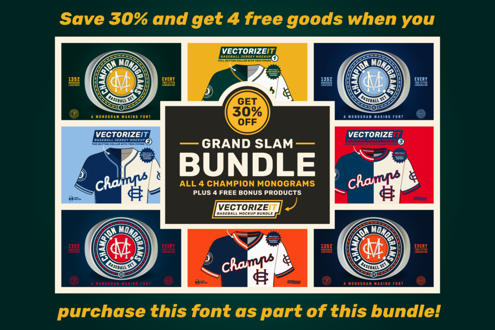 It includes all 4 Champion Monogram Fonts, plus 4 free bonus Vector Baseball Jersey mockups designed to work seamlessly with all 4 fonts. Starting at just $70, it's the best value for your money, hands down!