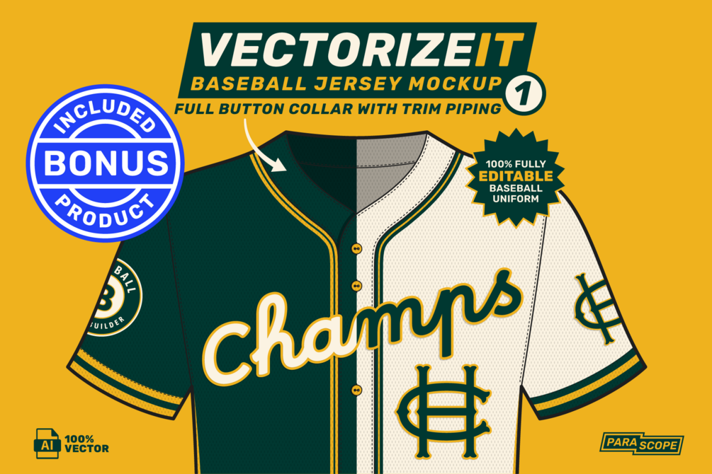 Plus there's a free BIG HITT'N BONUS! A Vector Baseball Jersey mockup which you can use to design and customize your own Baseball Jerseys right inside Adobe Illustrator.